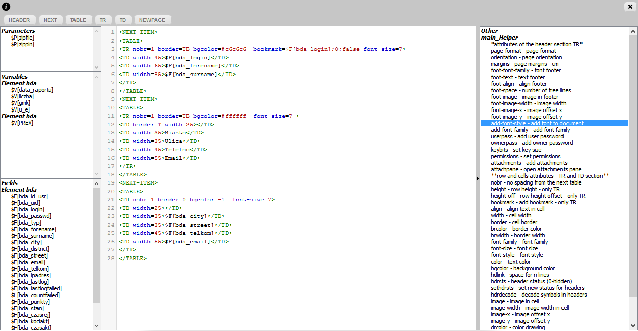 "f_AddHeadRepPDF"=>"\\\$V[out].=f_AddHeadRepPDF(\\\"tytul\\\", array(\\r\\n array(\\\"Data 1\\\",\\\"20\\\",\\\"C\\\")\\r\\n));",